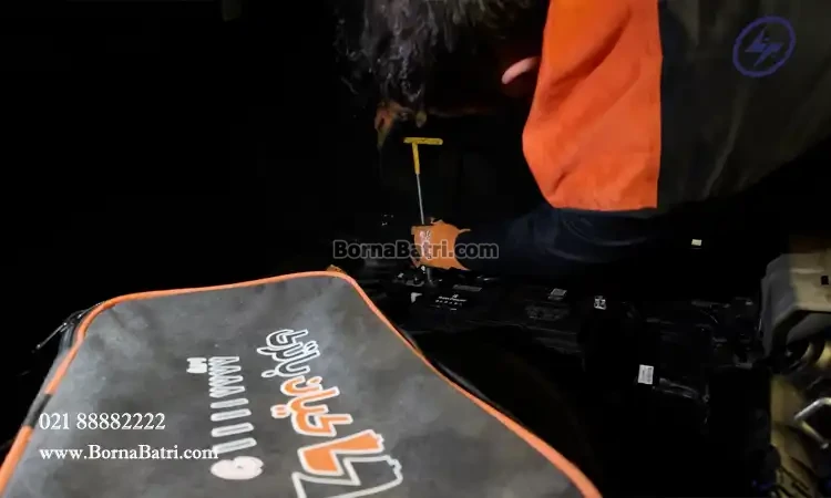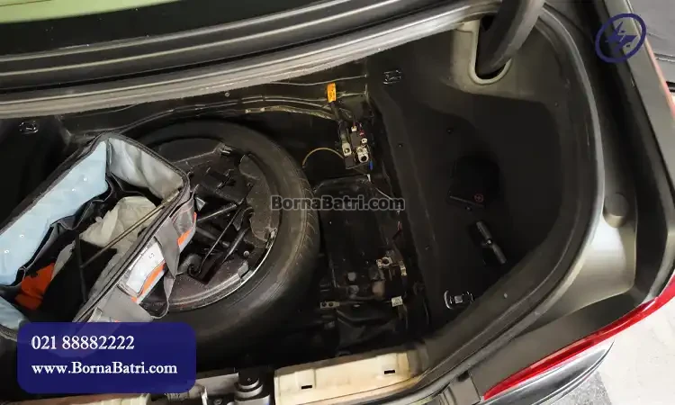 برای دسترسی ابتدا درب صندوق را باز کنید، موکت کف صندوق را کنار بزنید (معمولاً با گیرههای فشاری). پوشش پلاستیکی مستطیلی را با پیچگوشتی یا دست باز کنید. در مرحله بعد ابتدا کابل منفی (مشکی) را جدا کنید، سپس مثبت (قرمز). بست فلزی را با آچار ۱۰ باز کنید؛ باتری حدود ۲۲ تا ۲۵ کیلوگرم وزن دارد.