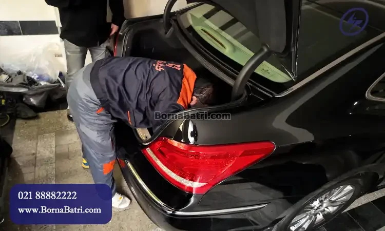 باتری هیوندای سنتنیال در صندوق عقب قرار دارد و دقیقاً سمت راست سرنشین (گلگیر شاگرد) زیر یک پوشش پلاستیکی مشکی پنهان است.