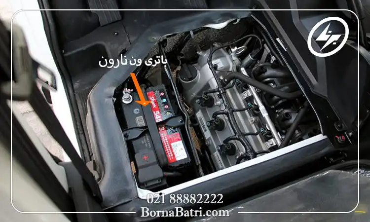 باتری ون نارون در داخل کابین و زیر راه پله ورودی درب سمت شاگرد قرار دارد. باتری در این قسمت از گرمای موتور محفوظ میماند. تصویر مقابل محل قرارگیری باتری ون نارون را نشان میدهد.