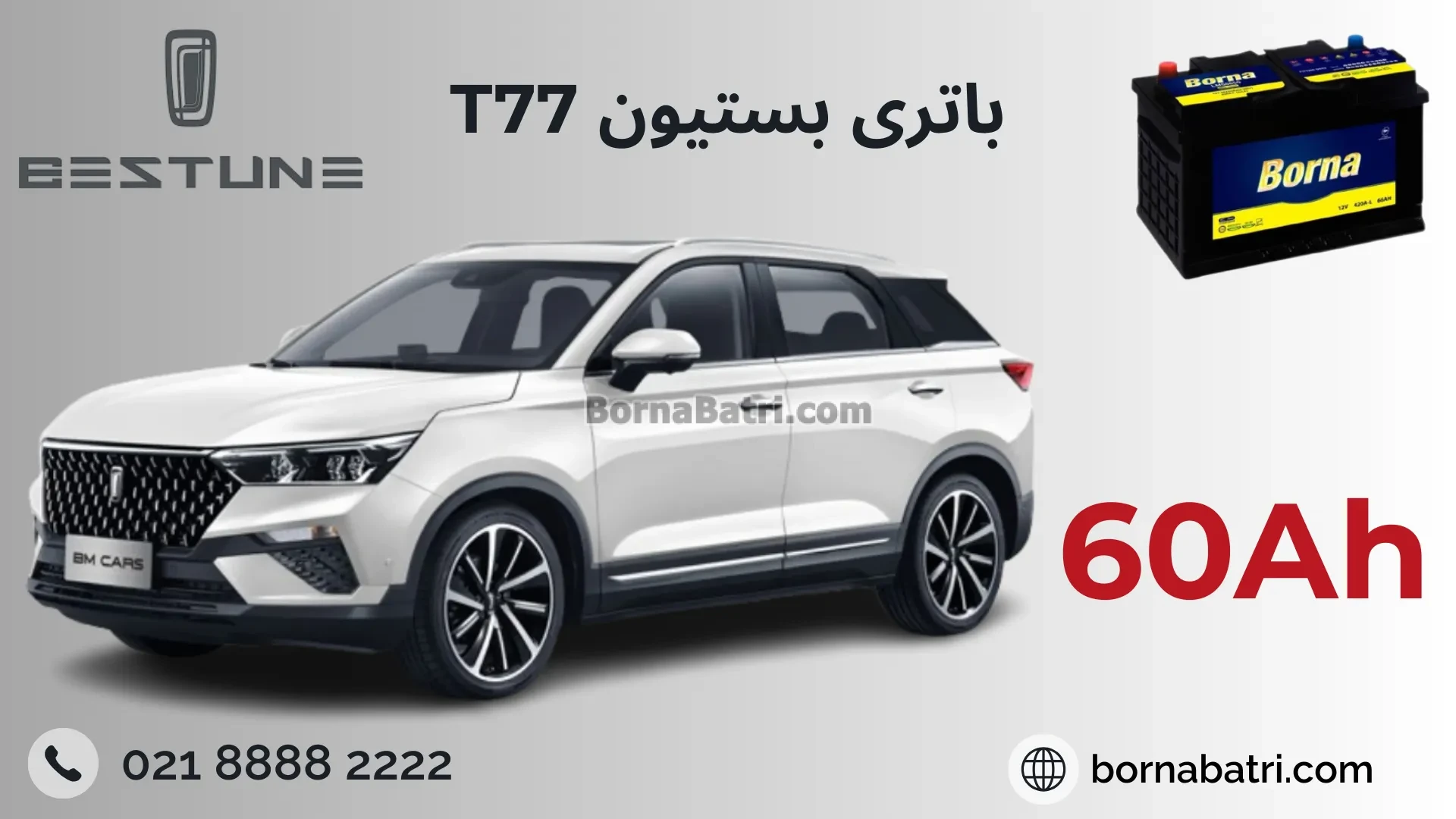 برای خودرو بستیون T77 باطری 60 آمپر آمپرساعت پیشنهاد میشود.