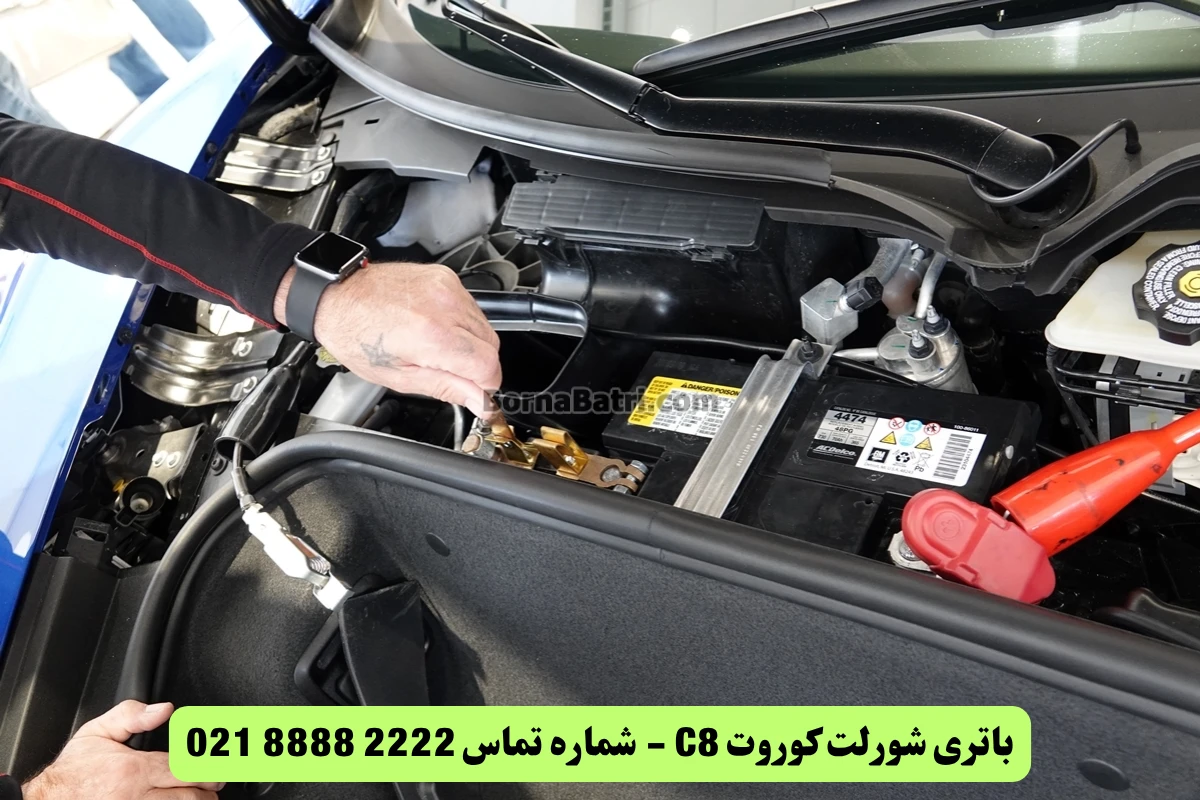 توجه داشته باشید که بر روی شورولت کوروت C8 باطری تا 60 آمپر میشود نصب کرد ولی بیشتر از باطری 60 آمپر به هیچ وجه برای شورولت کوروت C8 توصیه نمیشود.