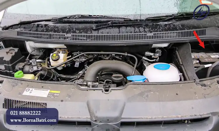 باتری فولکس واگن ترنسپورتر در قسمت جلوی خودرو و در محفظه موتور نصب میشود. تصویر مقابل محل قرارگیری باتری این خودرو را نشان میدهد. برای دسترسی به باتری کاپوت را باز کنید، اما اگر تجربه و تخصصی در این زمینه ندارید، از افراد متخصص کمک بخواهید. هر گونه اشتباه در نصب و تعویض باتری میتواند منجر به بروز خرابیهای پرهزینه شود.
