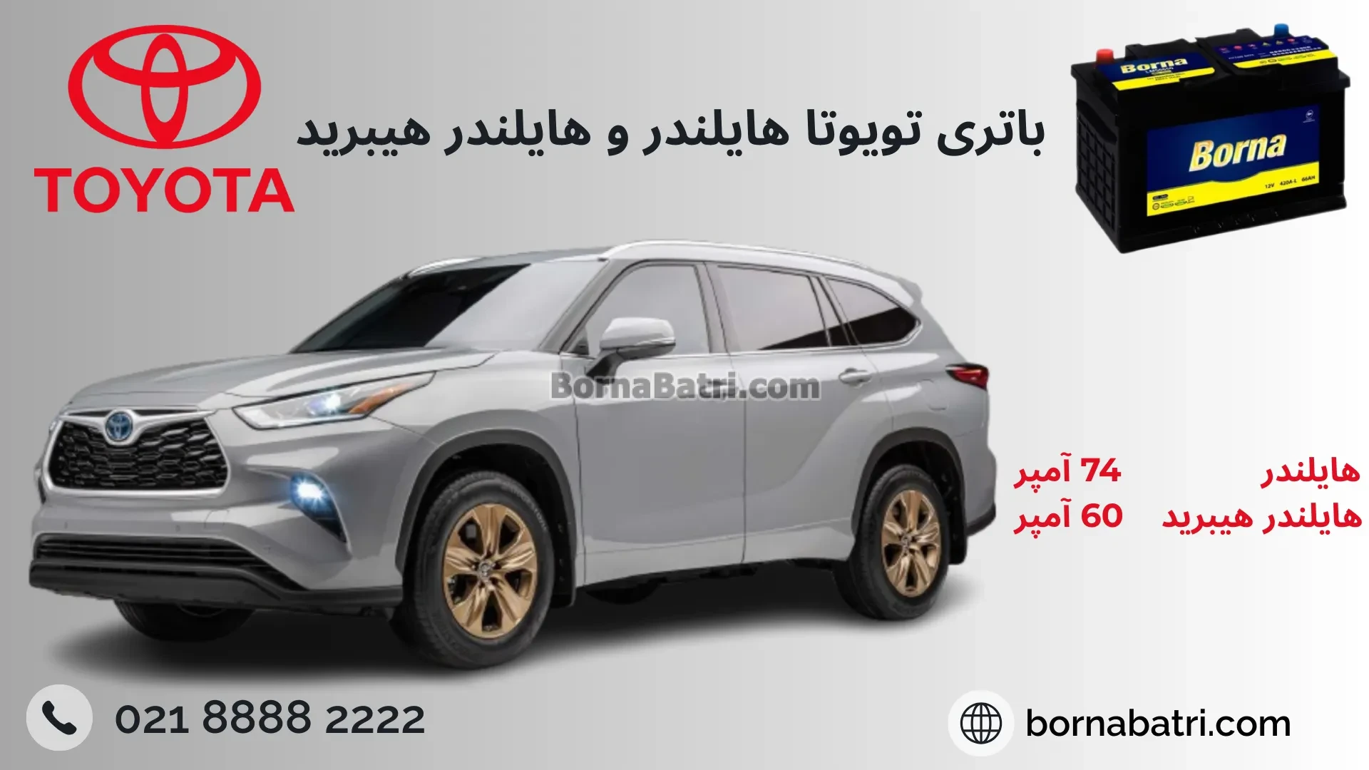 مشخصات باتری تویوتا هایلندر چیست؟ نوع تویوتا هایلندر باتری اصل باتری جایگزین همه مدل ها 74 آمپر پایه کوتاه قالب