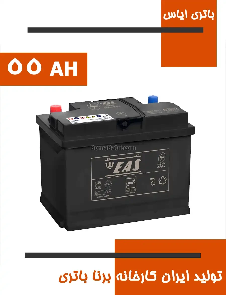 باتری ایاس (EAS) یکی از محصولات پرفروش و باکیفیت شرکت برنا باتری است که برای انواع خودروهای سواری و نیمه‌سنگین طراحی شده است. این باتری با بهره‌گیری از تکنولوژی کلسیمی و صفحات Expand Metal ساخته می‌شود و در دو نوع اتمی (سیلد، بدون نیاز به نگهداری) و اسیدی (قابل شارژ و سرویس) در بازار عرضه می‌گردد. استفاده از آلیاژهای مقاوم در صفحات داخلی باعث شده باتری ایاس دوام بالایی در شرایط آب‌و‌هوایی مختلف داشته باشد و در هنگام استارت‌زنی، جریان قوی و پایداری ارائه دهد. این ویژگی‌ها موجب شده باتری EAS به‌عنوان یکی از بهترین باتری‌های ایرانی شناخته شود. باتری‌های ایاس برنا باتری در ظرفیت‌های ۵۰ تا ۲۰۰ آمپر ساعت تولید می‌شوند و برای انواع خودروهای سبک، نیمه‌سنگین و حتی برخی ماشین‌آلات قابل استفاده‌اند. بیشتر مدل‌های این سری دارای ولتاژ ۱۲ ولت و گارانتی الکترونیکی معتبر ۱۴ ماهه هستند که اطمینان خاطر خریداران را افزایش می‌دهد.