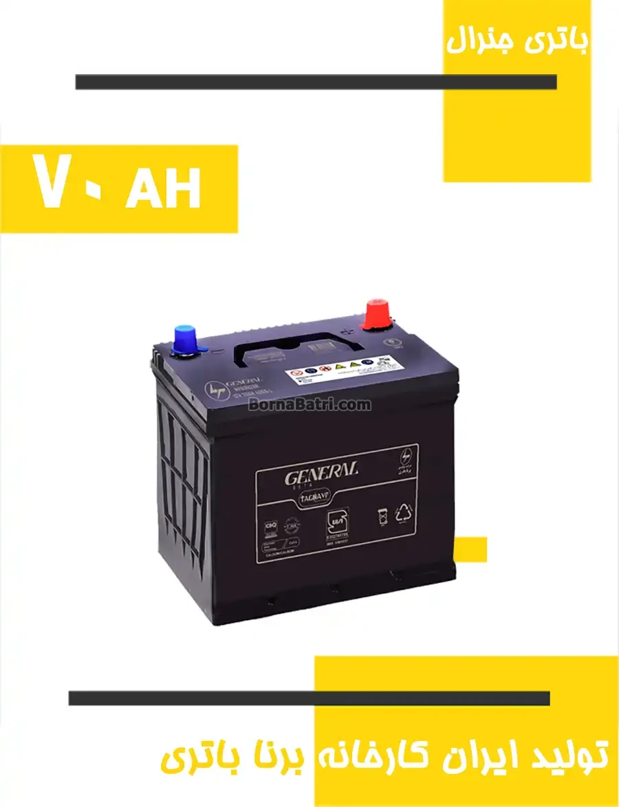 شرکت تولید کننده ی باطری جنرال یکی از قدیمی ترین و در عین حال بزرگترین تولید کنندگان باطری می باشد و  به علت مناسب بودن قیمت محصولات آن، در ایران طرفداران ریادی دارد. این نوع باطری، قابل استفاده برای ماشین های مختلف ایرانی از قبیل انواع پژو 405 – روآ – انواع پراید – انواع سمند – ال90 – مگان – انواع MVM – انواع خودروهای سواری و … می باشد.