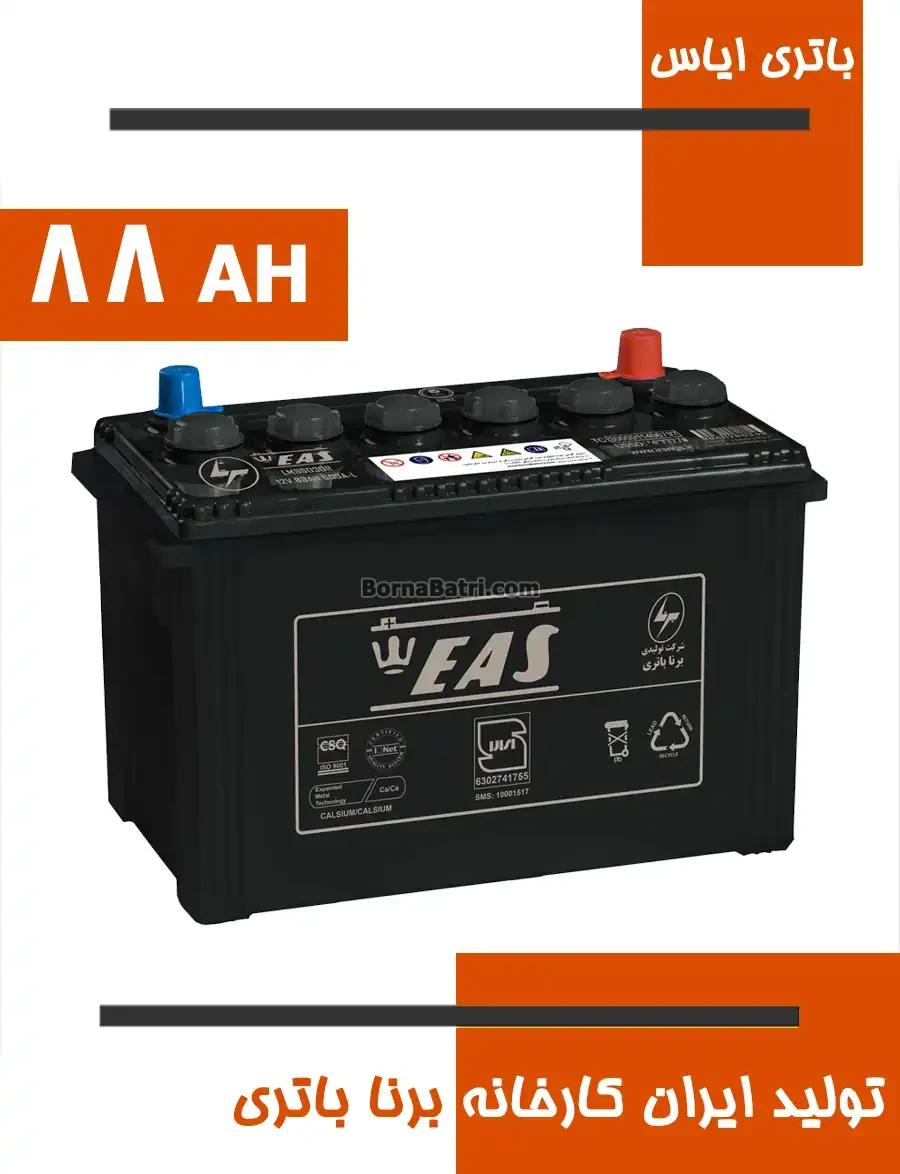 باتری ایاس (EAS) یکی از محصولات پرفروش و باکیفیت شرکت برنا باتری است که برای انواع خودروهای سواری و نیمهسنگین طراحی شده است. این باتری با بهرهگیری از تکنولوژی کلسیمی و صفحات Expand Metal ساخته میشود و در دو نوع اتمی (سیلد، بدون نیاز به نگهداری) و اسیدی (قابل شارژ و سرویس) در بازار عرضه میگردد. استفاده از آلیاژهای مقاوم در صفحات داخلی باعث شده باتری ایاس دوام بالایی در شرایط آبوهوایی مختلف داشته باشد و در هنگام استارتزنی، جریان قوی و پایداری ارائه دهد. این ویژگیها موجب شده باتری EAS بهعنوان یکی از بهترین باتریهای ایرانی شناخته شود. باتریهای ایاس برنا باتری در ظرفیتهای ۵۰ تا ۲۰۰ آمپر ساعت تولید میشوند و برای انواع خودروهای سبک، نیمهسنگین و حتی برخی ماشینآلات قابل استفادهاند. بیشتر مدلهای این سری دارای ولتاژ ۱۲ ولت و گارانتی الکترونیکی معتبر ۱۴ ماهه هستند که اطمینان خاطر خریداران را افزایش میدهد.